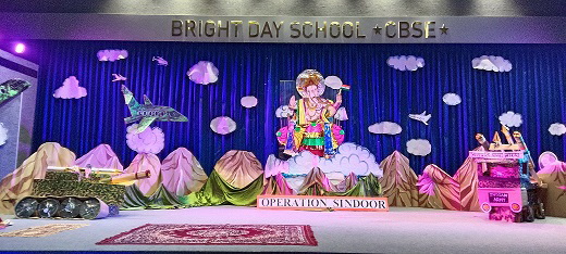 Bright Day School commenced the celebration of Ganesh Chaturthi festival with the ‘Ganesh-Sthapana Puja' performed by our Chairman Dr Simit Shah and Directress Ms Swara Shah. Our Principal, Ms Neeta Sharma, Heads, Teaching and Non-Teaching staff members and students joined the puja to solicit God's blessings. Brightians sang songs during the morning assembly in glory of Lord Ganesha and students tapped their feet and clapped to the beats of the music. Brightians made beautiful paintings of Lord Ganesha to adorn the classrooms and corridors. The theme of the celebration was 'Operation Sindoor'.