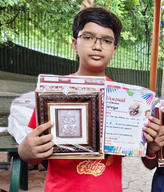 Rudraksh D. Suthar from VI-A secured 1st position and was awarded a Certificate and Silver Ashtavinayak Ganesha Frame. Ishani S. Patel from V-B, Mehaan R. Kotadia from VII-A and Keyan Rana from VI-A were awarded Certificate and Silver Ganesha Frame.