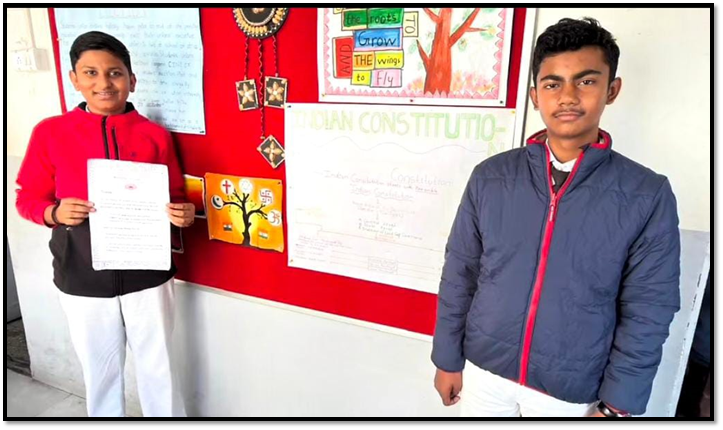 26th November is celebrated as the Constitution Day in the school. The purpose of this celebration was to make the students aware about the democratic values mentioned in the constitution. They took an oath to remain faithful to the country and perform their duties well. The preamble was discussed in the classroom.