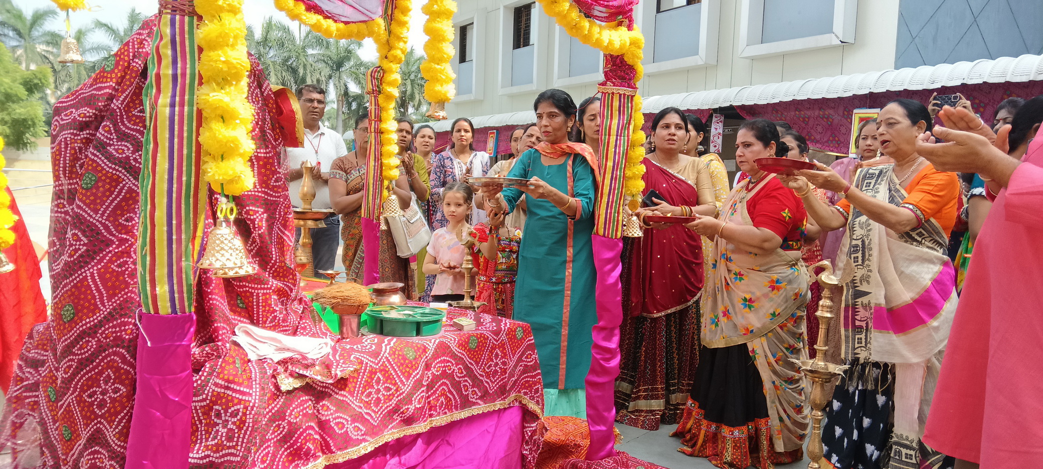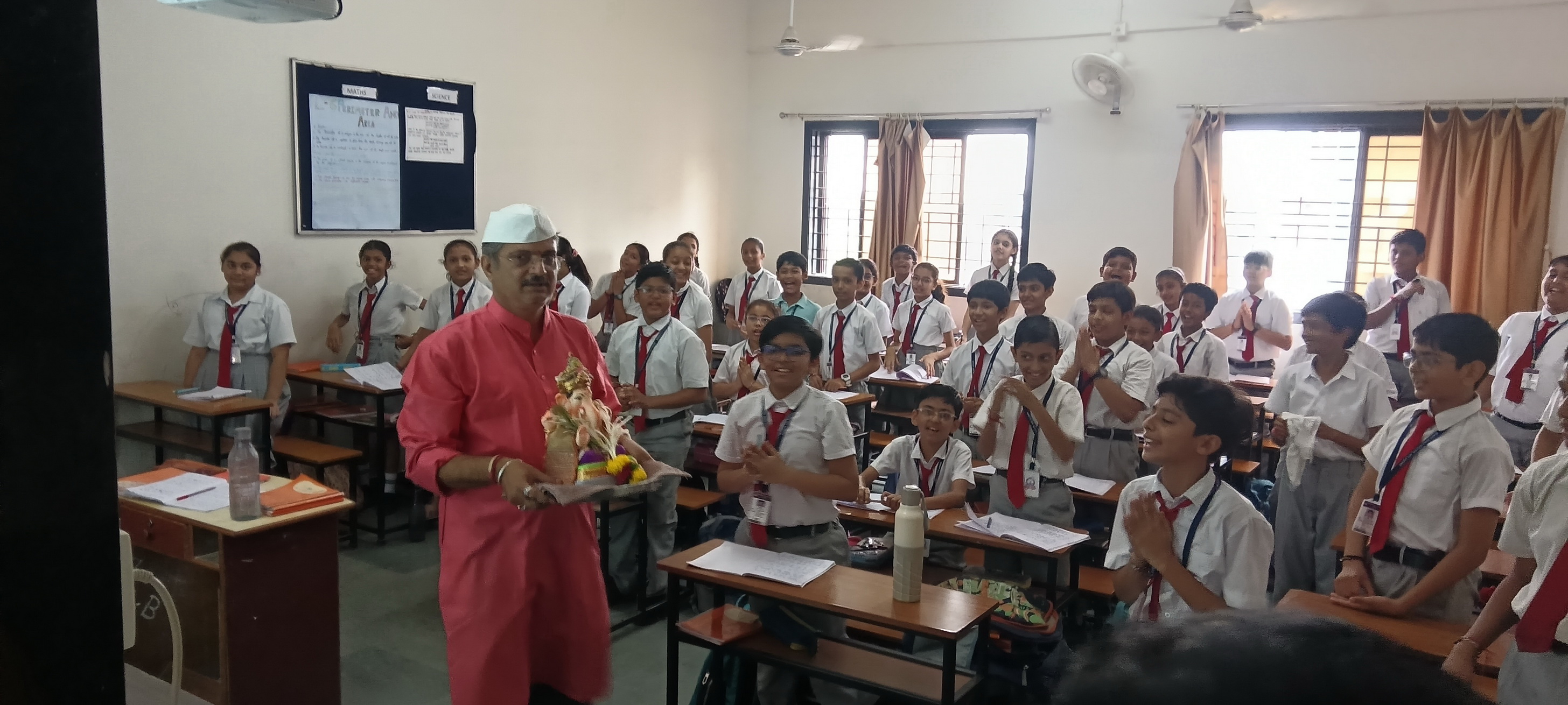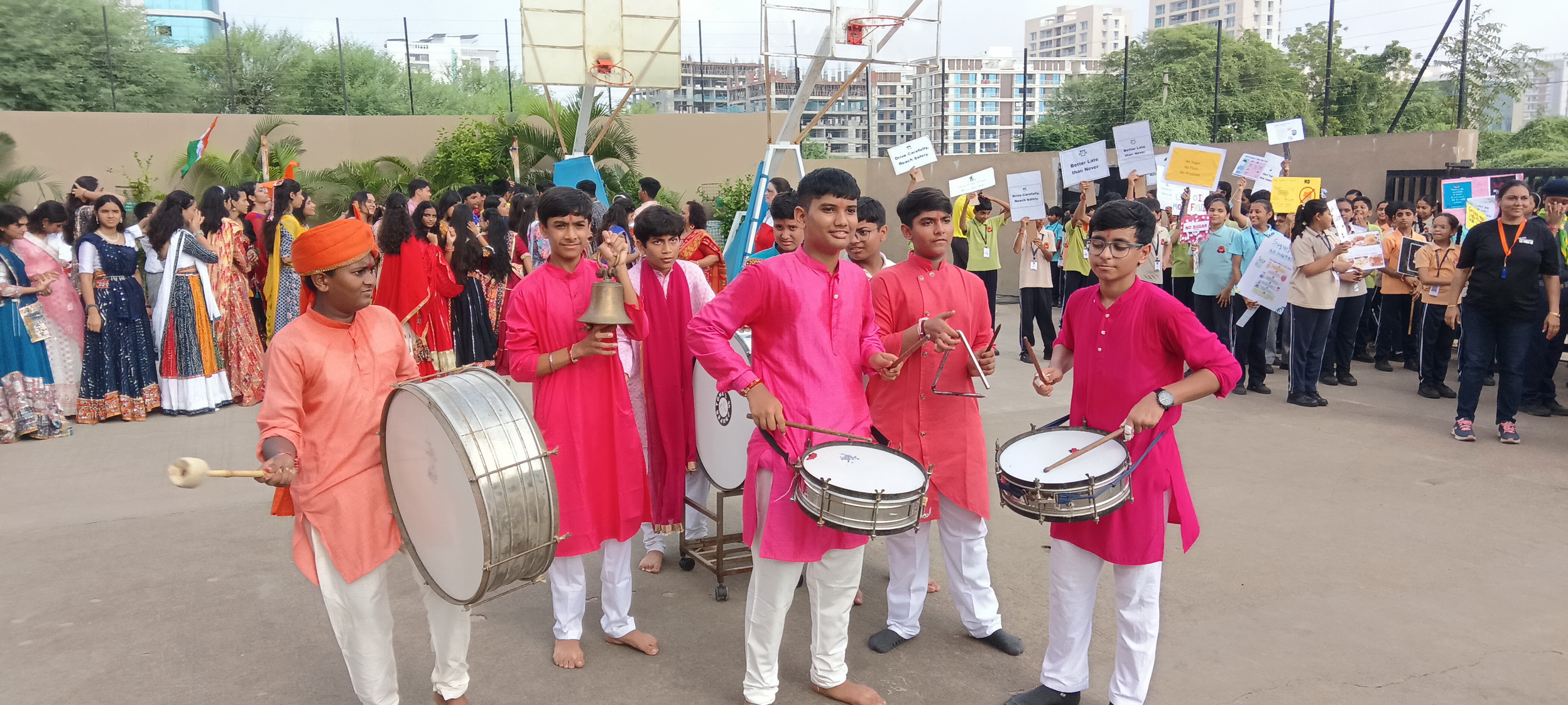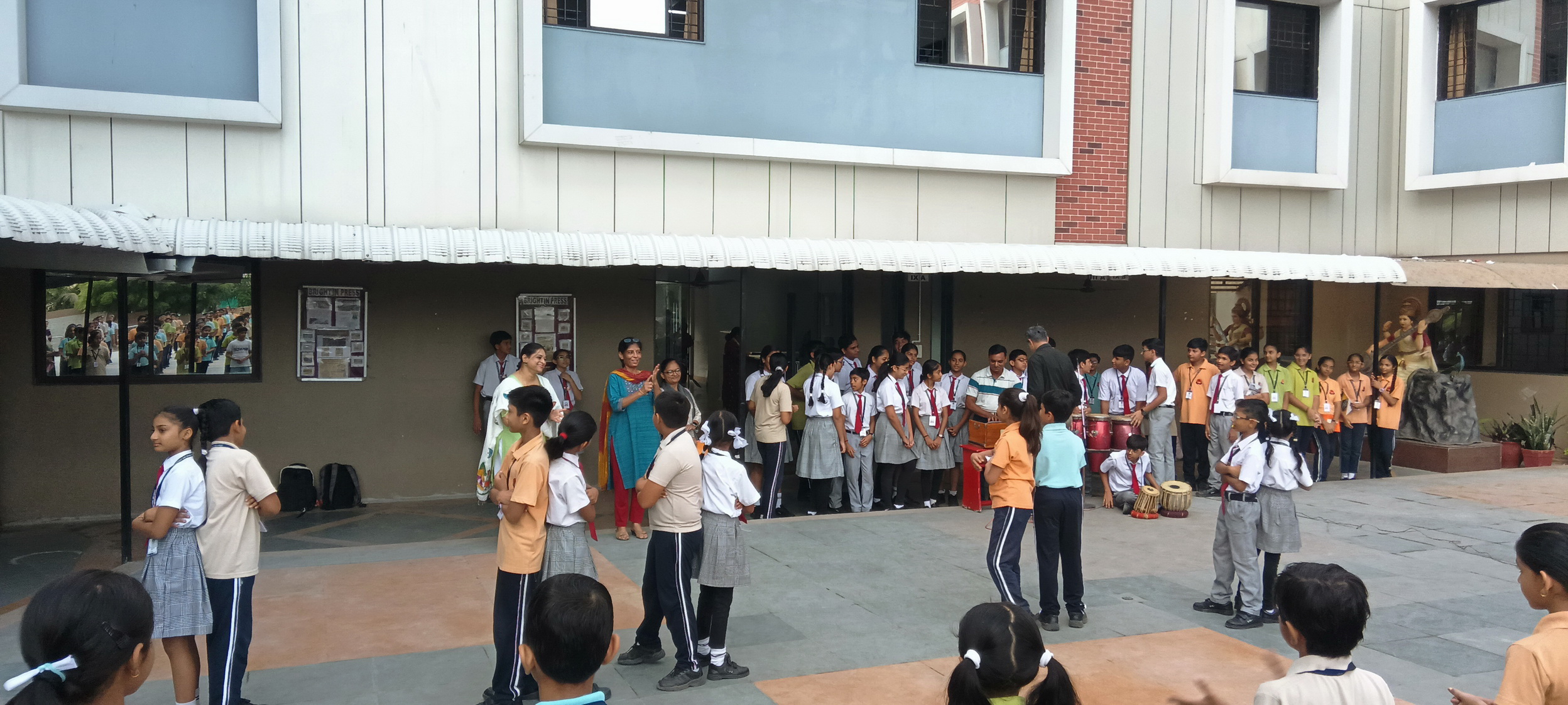 We ceremoniously brought Lord Ganesha's idol into the premises. The idol was brought in a 'Palki' which was escorted enthusiastically by a procession of Brightians ornately decked up as various deities, including Lord Ganesha, Lord Shiva and Goddess Parvati, as well as birds, animals, army, navy, air force and freedom fighters. Scouts and Guides and NCC students joined in, while Brightians showcased their energetic side with a Lezim performance and traditional garba dance. Brightians carried creative and informative sugar and oil boards, spreading awareness about the dangers of excessive consumption. Brightians also promoted 'Sadak Suraksha' i.e. 'Road Safety' during the procession.