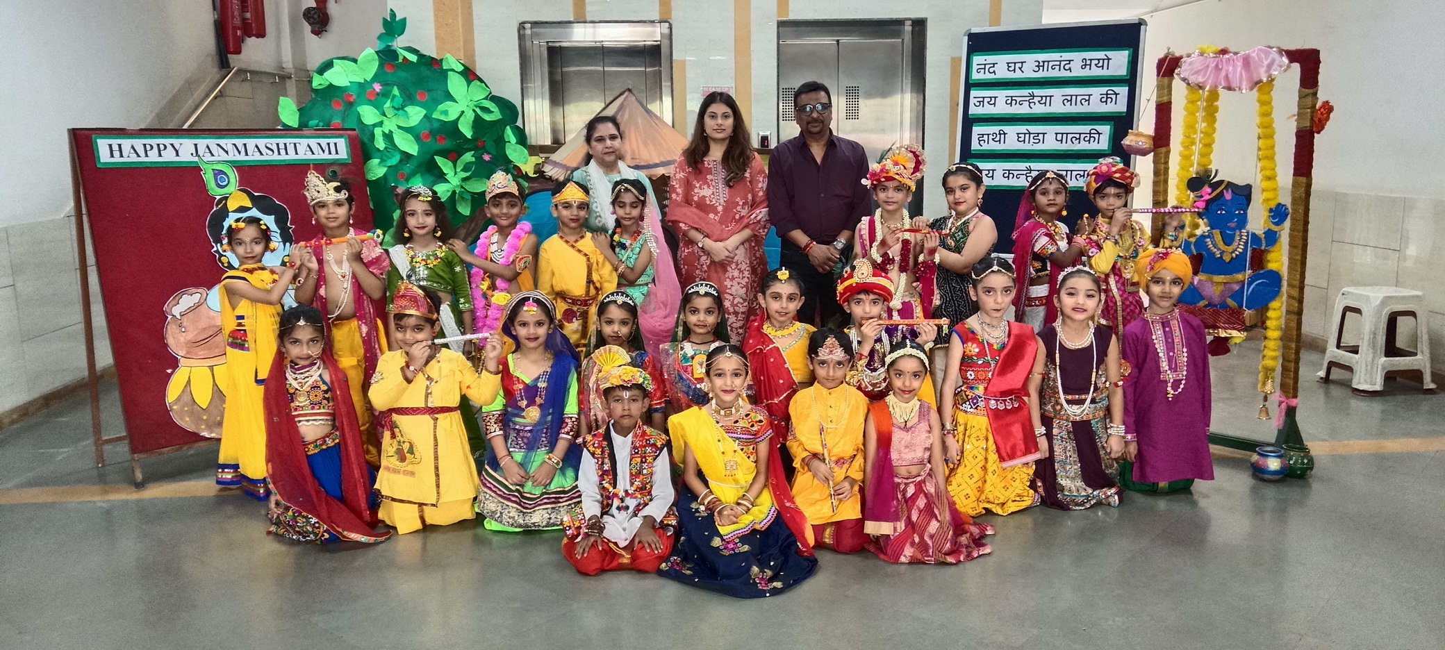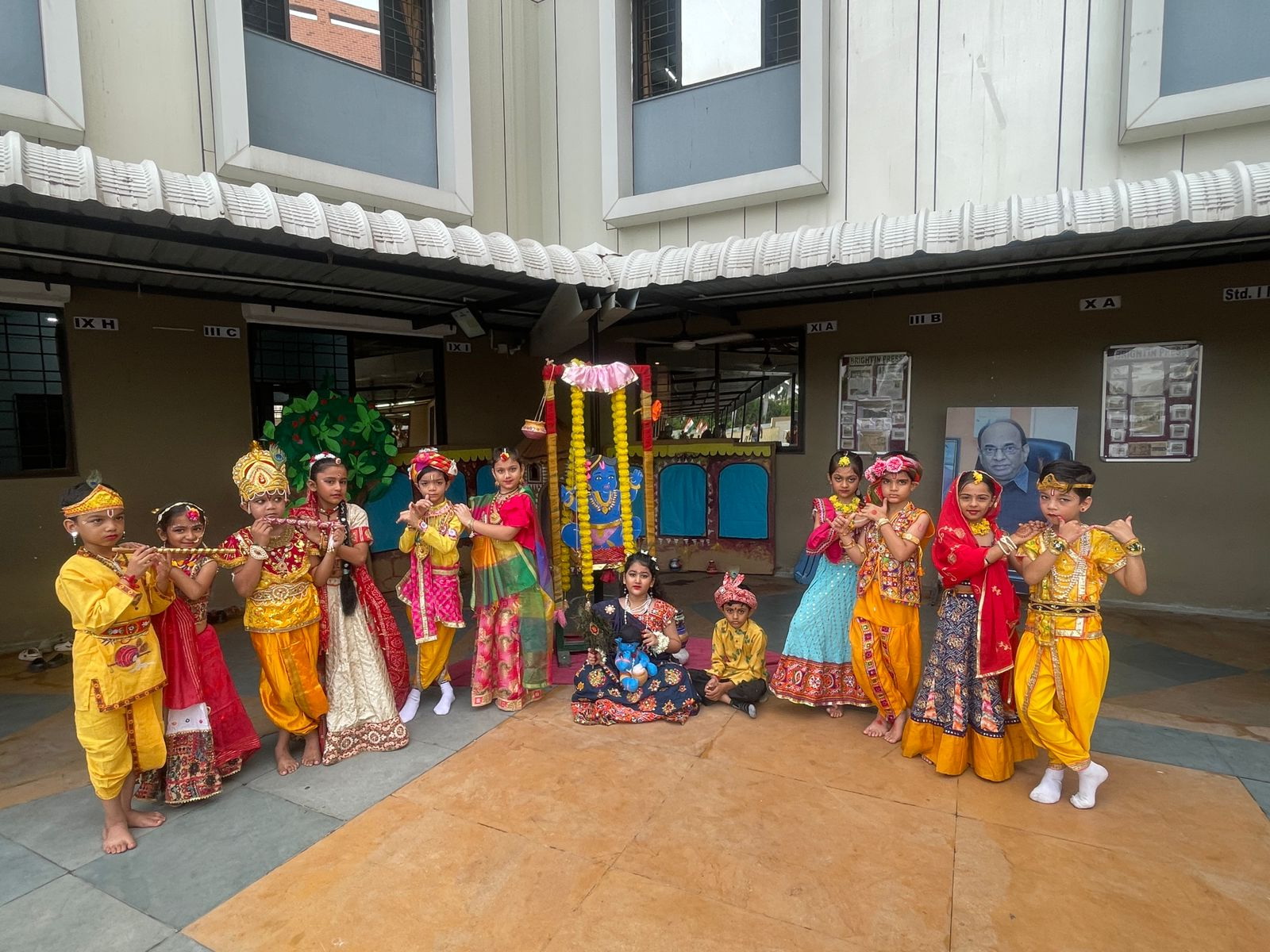 It was celebrated with great devotion and exuberance. During the morning assembly, Brightians enthralled everyone with soul-stirring songs dedicated to Lord Krishna, skilfully guided by the music teacher Mr. Jayesh Patel. The assembly also shed light on the significance of the festival, enriching the students' understanding of its cultural and spiritual importance. Brightians of Std. I and II, adorned themselves in vibrant attires as Lord Krishna, Radha and the Gopis. They enthusiastically brought to life, scenes of 'Krishna Janma' and shared captivating anecdotes from the life of the revered God. In the classrooms, teachers shared inspiring videos that highlighted the life and teachings of Lord Krishna. Brightians unleashed their artistic talents, crafting beautiful drawings, melodious flutes and exquisite decorative pots.