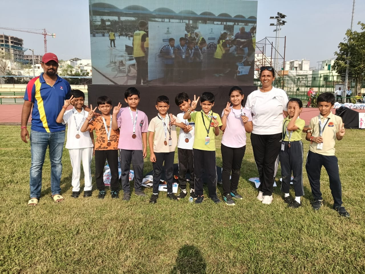 Vihaan Patel, Jenish Modi, Ved Shah, Madhav Shah, Jainil Thakor, Jainil Trivedi, Aarav Permar, Nilax Jaiswal, Jay Shah, Tatva Thakkar of Std. VIII & Aarav Jaiswal of Std. VII secured the SGFI U-14 Basketball District Level Tournament 2025! They clinched this big win. Vihaan Patel, Jenish Modi, Ved Shah, Madhav Shah, Jainil Thakor have been selected for the State Level Coaching Camp. The students were mentored by our PE teacher Ms. Chitra Gavli.