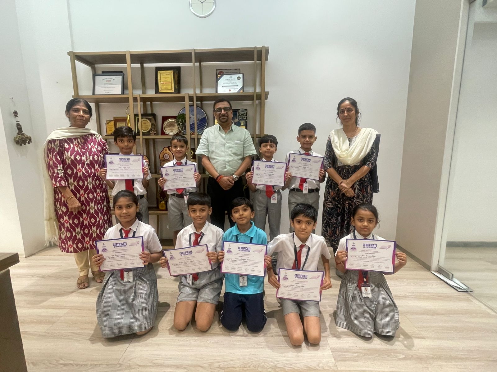- Aarav Kathiriya of Std. V has scored distinction in Grade X & XI in UCMAS Abacus Competition.