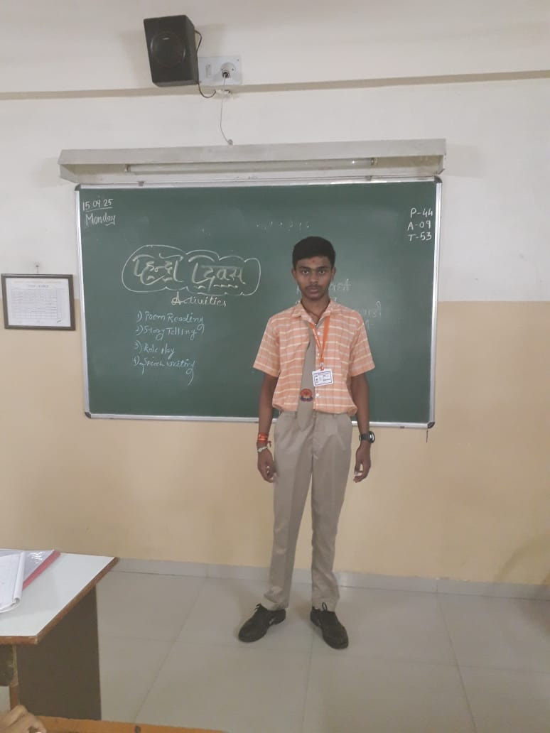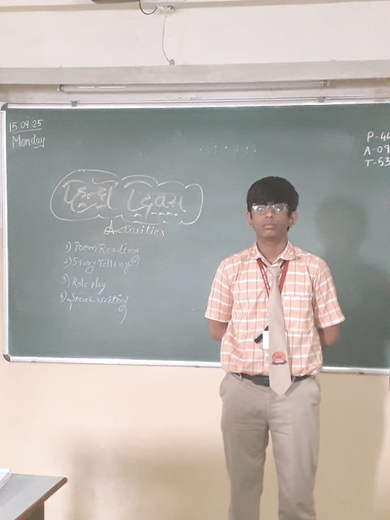 जैसी प्रवृत्तियाँ रखी गई थी। इस कार्यक्रम का आरंभ कवि ‘ हरिवंशराय बच्चनजी ’ की कविता ‘ कोशिश करनेवालों की कभी हार नहीं होती ’ से हुआ था। इस कार्यक्रम में छात्रों ने अपना हिन्दी प्रेम दिखाया था। शिक्षक ने हिन्दी भाषा के रूप में हिन्दी महत्त्व समझाया और उदाहरण देकर हिन्दी की उपयोगिता पर प्रकाश डाला। इस कार्यक्रम में कई छात्रों ने कविताएँ सुनाई, कहानियाँ सुनाई और नाटिकाएँ भी प्रस्तुत की गई। शिक्षक ने सभी छात्रों को समझाया की राष्ट्रभाषा के अभाव में क्या – क्या समस्याएँ खड़ी होती है। अंत में शिक्षक ने सभी छात्रों को ‘ हिन्दी दिवस ’ की शुभकामनाएँ दि, छात्रों का आभार व्यक्त किया और राष्ट्रगीत के साथ कार्यक्रम संपूर्णरुप से सम्पन्न हुआ।.