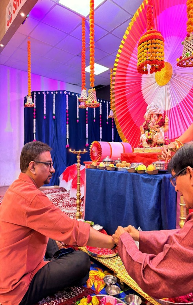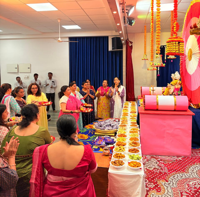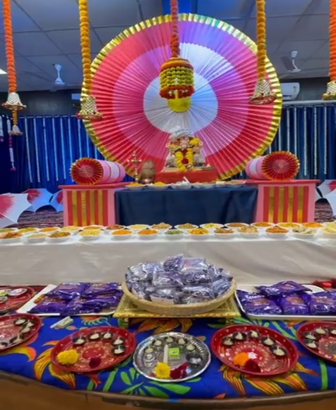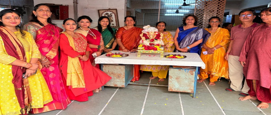 29th August 2025, Friday the programme began with prayers and offerings, followed by Annakut where a variety of snacks and sweets were beautifully arranged and offered to Lord Ganesha. Students, teachers and staff actively took part in the rituals.
