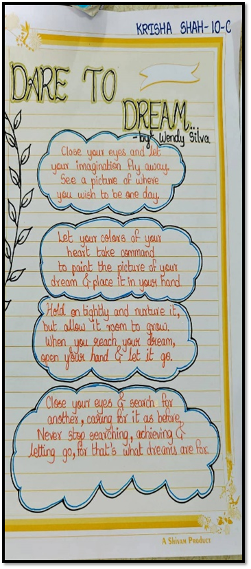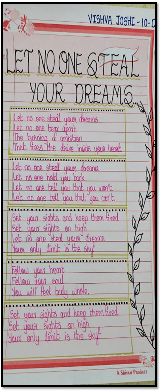 In order to bring out the hidden talents from the students and develop their interests in literature, the poetry recitation activity was conducted. The students had to recite the poem written by them or by any other poet. The students performed the activity with enthusiasm. Even Mr Mobin Vahora, the English teacher recited a self written poem.