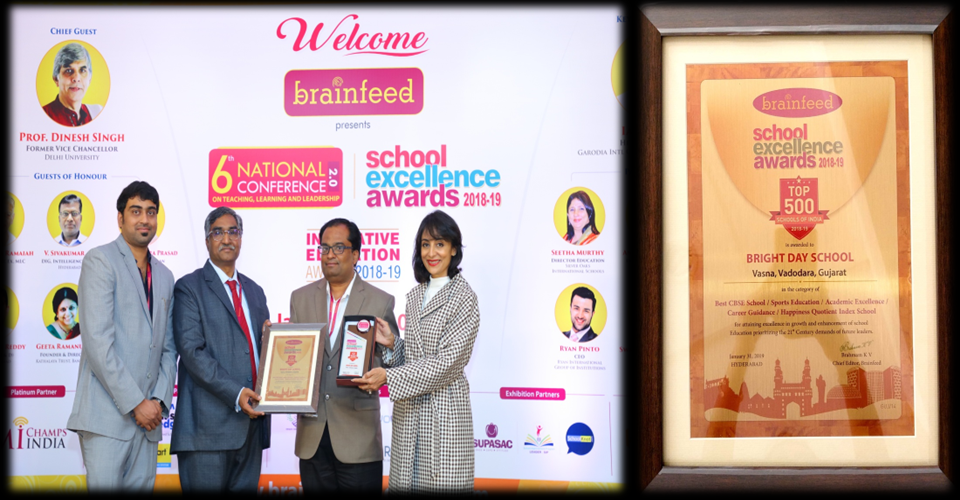 Bright Day School, CBSE Vasna Unit received the School Excellence Award 2018-19 among top 500 Schools of India for the categories like Best CBSE School of Gujarat, Excellence in Sports Education & Career Guidance, Best Academic Excellence School and Best Happiness Quotient Index School. The award was conferred by Branfeed.